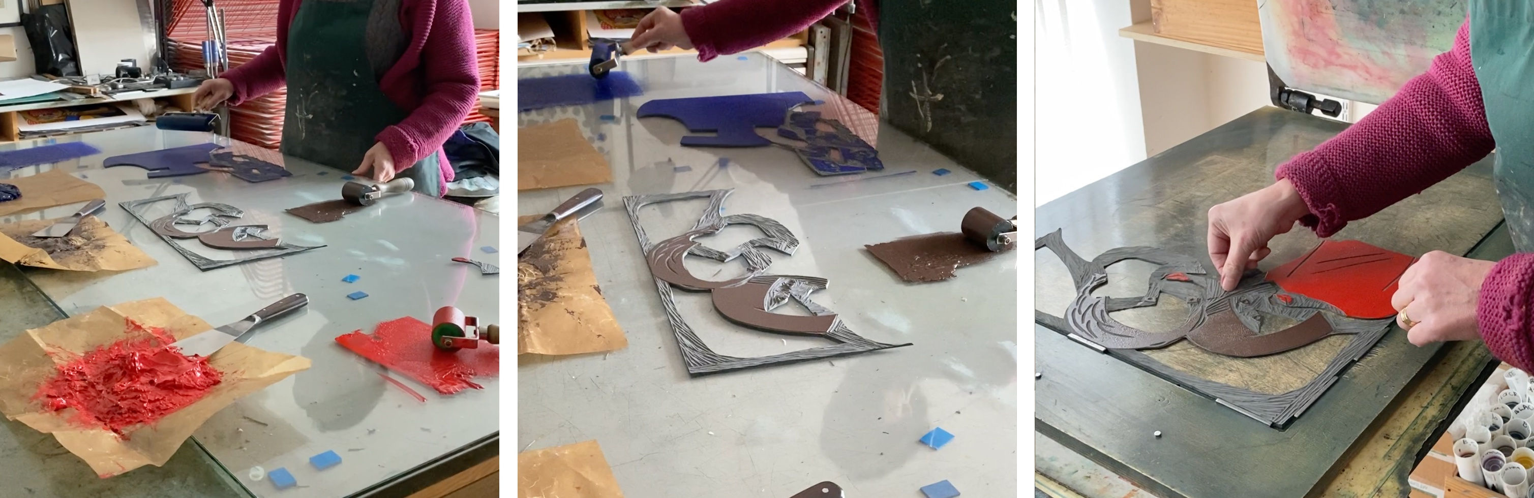 Once these first colours had dried, Anita added a further three colours; Blue, Brown and Red. After inking them all separately, she pieces them together on the printing press, carefully placing the paper down on top.