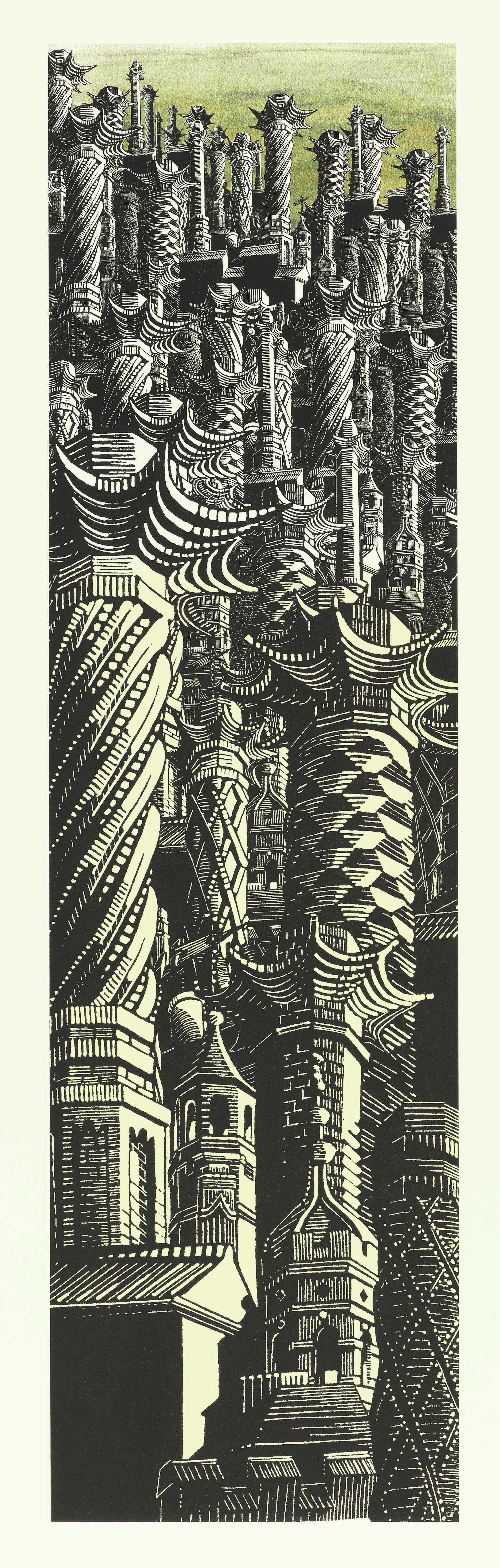 As artist-in-residence at Eton College (in spring 2016), I concentrated, primarily, on ‘looking up’, which later became the title of a multiple-block wood engraving which will be in the exhibition. Looking up, my attention was first caught by the distinctive red-brick Tudor chimneys on the college’s Foundation Building. Beginning by making pen and wash sketchbook studies and taking many photos, I later portrayed them in the engraving (also in the exhibition) entitled: “Towers and Tudor Chimneys”. It shows a substantial collection of Eton’s many and varied chimneys clustered together within an invented rooftop composition. Eton’s other architectural curiosities and idiosyncrasies also inspired my work during the residency. These included the chapel’s castellated turrets, out of which sprout tiny bell towers, and its elaborately contrived 1950s fan vault (ceiling) which, contrary to its construction in concrete, ambiguously suggests the lightness of airy, soaring materials. The College Library with its white neoclassical dome and mathematically configured stone-pineapple embellishments also inspired new engravings and these will all feature in the exhibition. In contrast to these (and other) images born of ‘looking up’, the view looking down from a window above the college’s print studio was the source for ‘Crossing the Courtyard’, an engraving of Eton boys traversing the space directly outside the Drawing Schools and Farrer Theatre. Working in collaboration with the college’s design department, two large lithographs were created in Photoshop, using repeated and manipulated details of my engravings to create two entirely invented compositions. One, entitled “Rotunda x 20”, is intended to suggest links between the architecture and ambition of Eton, London and ancient Rome, while the other: “Urban Jungle”, posits an ever-growing army of the college’s chimneys, which begin to evoke a dense, surreal, forest. These two prints were both printed, after my Eton residency had ended, at Hole Editions in Newcastle where I worked in collaboration with master-printer Lee Turner. “Urban Jungle” is a development of my wood engraving of Tudor-era chimneys. It used repeated elements of my “Towers and Tudor Chimneys” engraving rescaled, regrouped and multiplied many times to create a sense of a vast forest of man-made trees. I had in mind, when creating this image, Mervyn Peake’s wildly eccentric multi-turreted Castle Gormenghast from his “Gormenghast” fantasy series of Gothic novels (begun in 1946). I was also thinking about human-generated global warming and deforestation. There is intended irony and double meaning in the work’s title. The meaning of the phrase “urban jungle” is understood to describe an urban area filled with buildings and regarded as especially unwelcoming or dangerous, though the word “jungle” itself is dictionary-defined as an area of land overgrown with dense forest and tangled vegetation. I hope that the image in the context of its title suggests both a wild urban sprawl and also a sense of pollution associated with deforestation.
