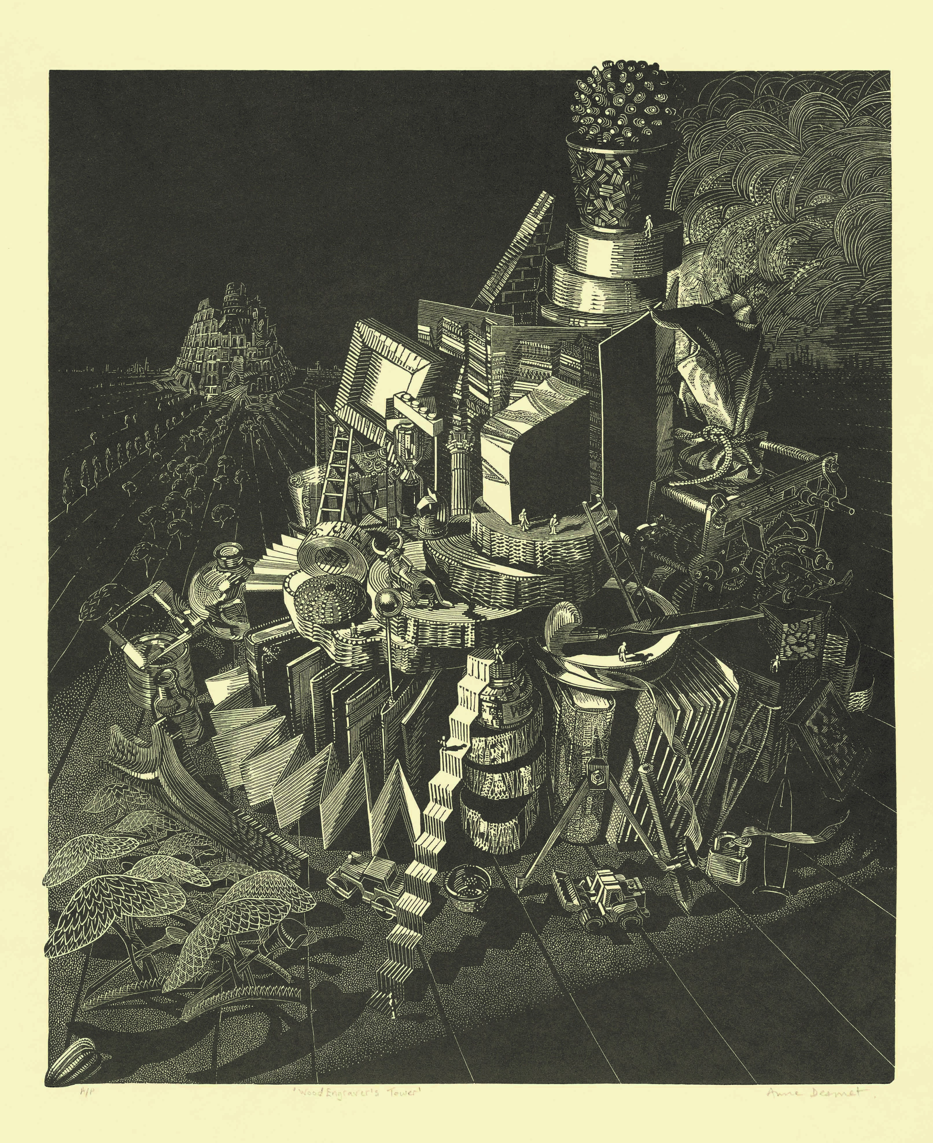 The features that these drawings all shared were that they were rarely bigger than A4 (as it’s hard to manage anything larger when you’re semi-reclined in bed) and they were very detailed because I had lots of time to pour into them. Drawing became something of an obsession so I did reach a point where I couldn’t imagine doing anything else, but the idea of trying to make art my profession came much later. I had no real awareness of art and artists, past or present, at that point and there was no culture of contemporary art that I was aware of in Liverpool in the 1960s/70s. So, in my late teens, when I decided to apply to study art rather than classics at university, I hadn’t really entertained the idea of being “an artist”. I think I still thought “art” would be a hobby I’d have to do in my spare time while working in some other field. Going to art school didn’t make me feel much more confident about how I might make art my living but it certainly loaded the dice against alternative career choices. When I applied to art school, I had a portfolio full of intensely detailed small drawings and had become particularly interested in chiaroscuro, fine detail and the interplay of black and white marks. Early on in my three years at the Ruskin School of Art (Oxford university), the then visiting tutor Joe Winkelman PPRE introduced me to woodcut while the excellent full-time printmaking tutor, Jean Lodge RE, introduced a wide range of other print techniques, all of which I tried. She thought wood engraving would suit me because it would enable me to lavish as much time and attention on relatively small works as I was already doing on one-off drawings, but I would be able to print an edition and sell each print for a much more affordable sum than would be viable for one-off pieces. However, more importantly, she felt that using engraving tools to cut end-grain boxwood would expand my mark-making repertoire and make my images more dynamic. She was right and I am unfailingly grateful to her.