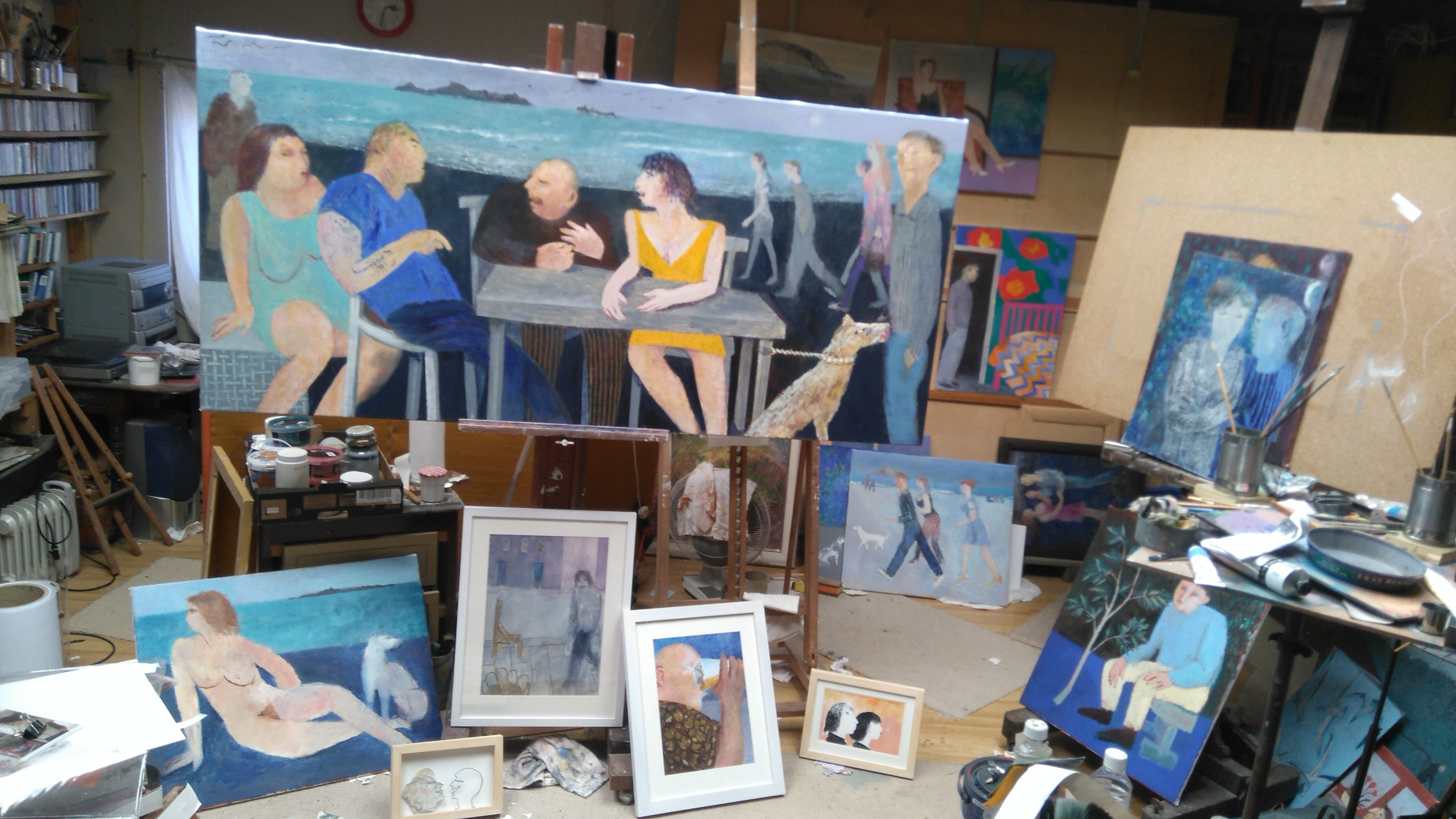 I was very shocked by the outcome of the EU Referendum. The great European experiment had, it seemed to me, started to realise the age old dream of reaching out to embrace all the people of Europe, and it had done this, most significantly, through peaceful means. Despite all of the EU’s shortcomings, this is a fine aspiration. The EU allows and encourages freedom and expanded horizons. We need to be more united to be more free. Some people feel as emotionally opposed to the EU as others feel in its favour, and this has opened up awful divisions in our society. I wanted to use my painting to reflect on these violent interactions. There are a number of paintings in this show based around a big picture, ‘Brexit Camp’. This is an angry painting about the arguments leading up to the Referendum. Two men argue about the benefits of leaving the EU. The woman in yellow indignantly takes up the dispute, whilst the other carelessly goes along with whatever is said. A cynical manipulator stands on the right, whilst a group of young people, who will inherit the situation, trudge along the shore. Another small painting shows two naked people stranded on a lonely rock in the sea.