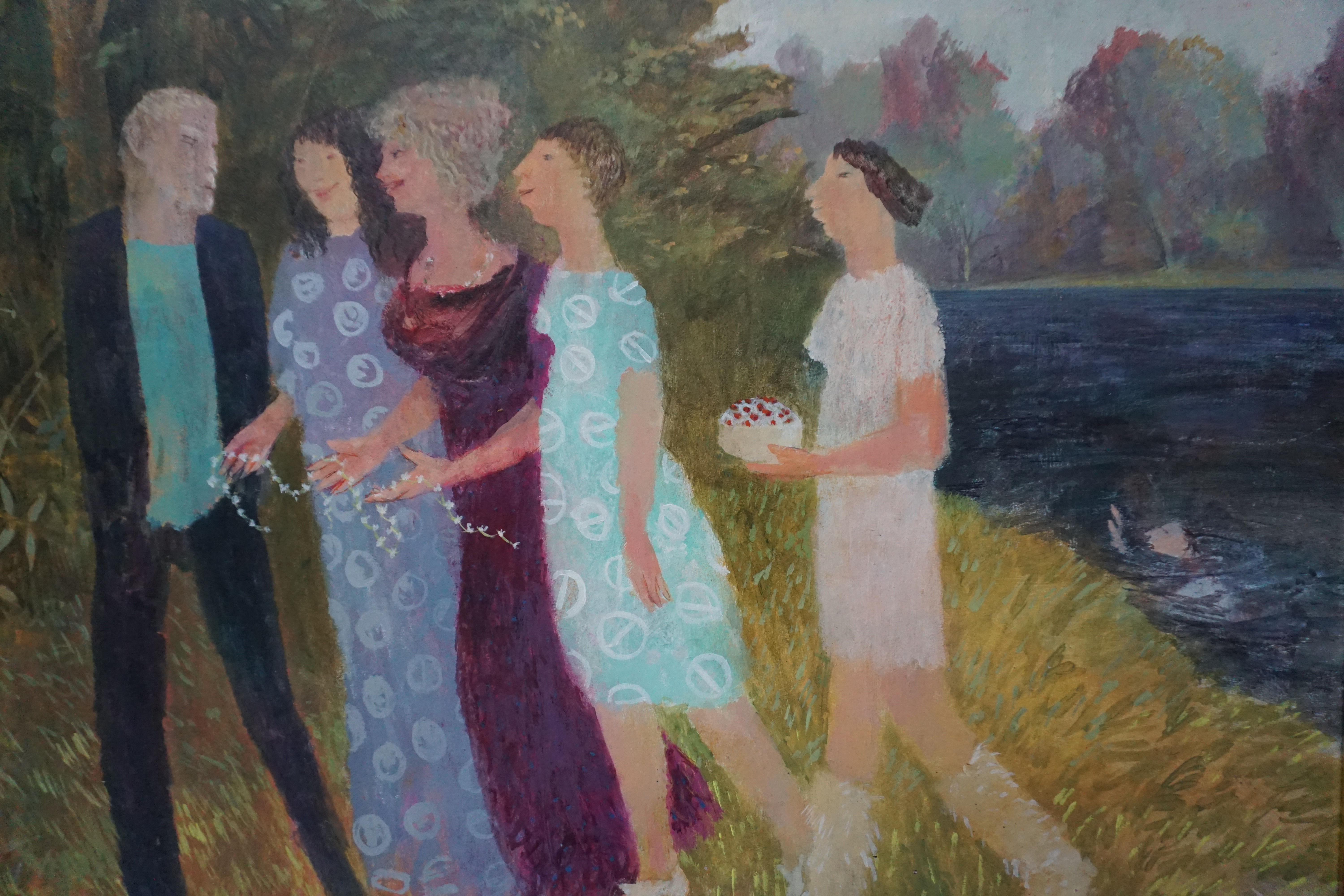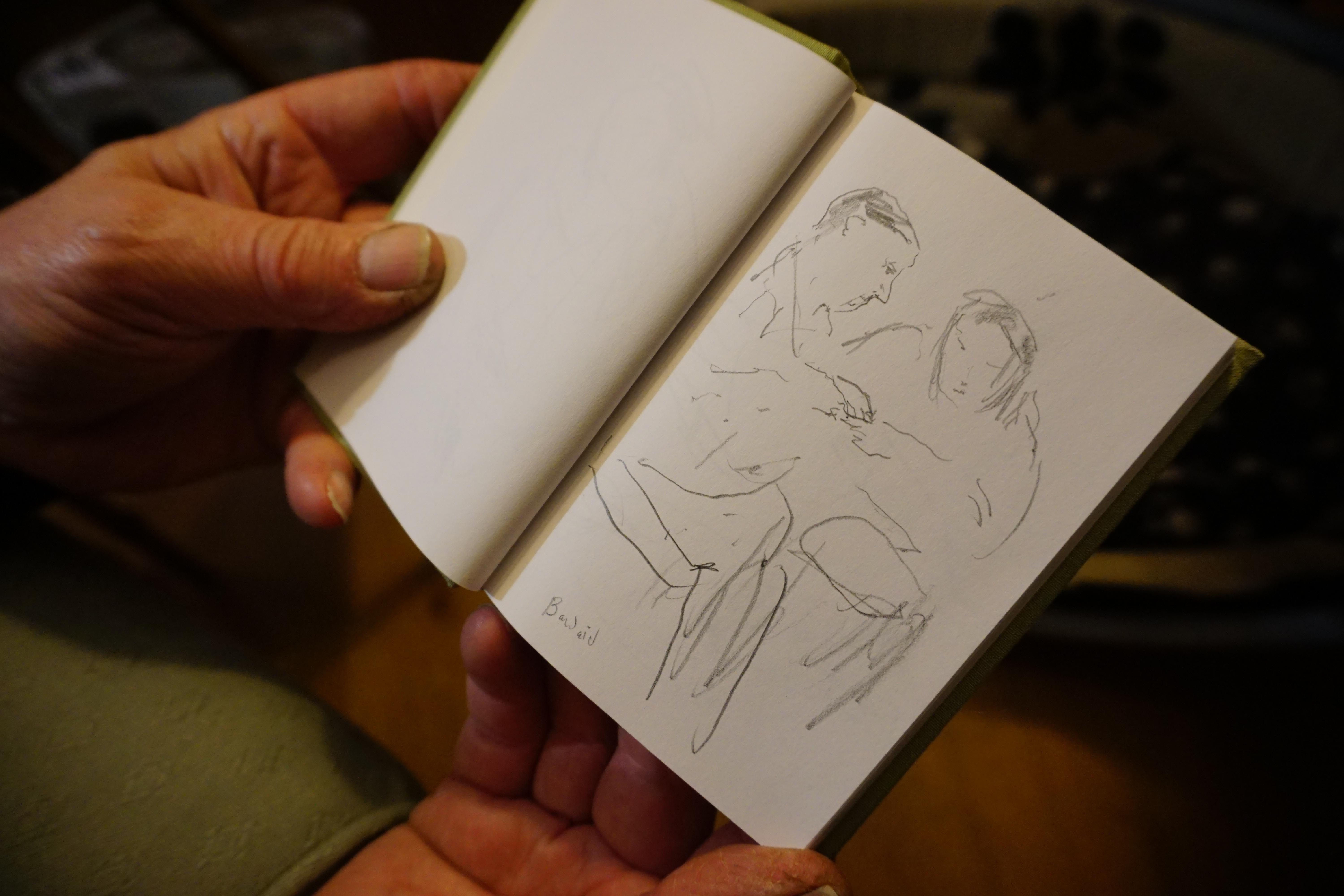 I am intrigued by relationships between people. Sometimes I note interesting incidents in my sketchbook, and sometimes these lead to paintings. The other day on a visit to London, I was sitting on the tube next to my son Edmund. Opposite I saw a man putting a plaster on his girlfriend’s finger. How caring, I thought, and I scribbled a note of it in my book. ‘Did you see that?’ I asked Edmund. ‘No, I didn’t notice anything’, he said.