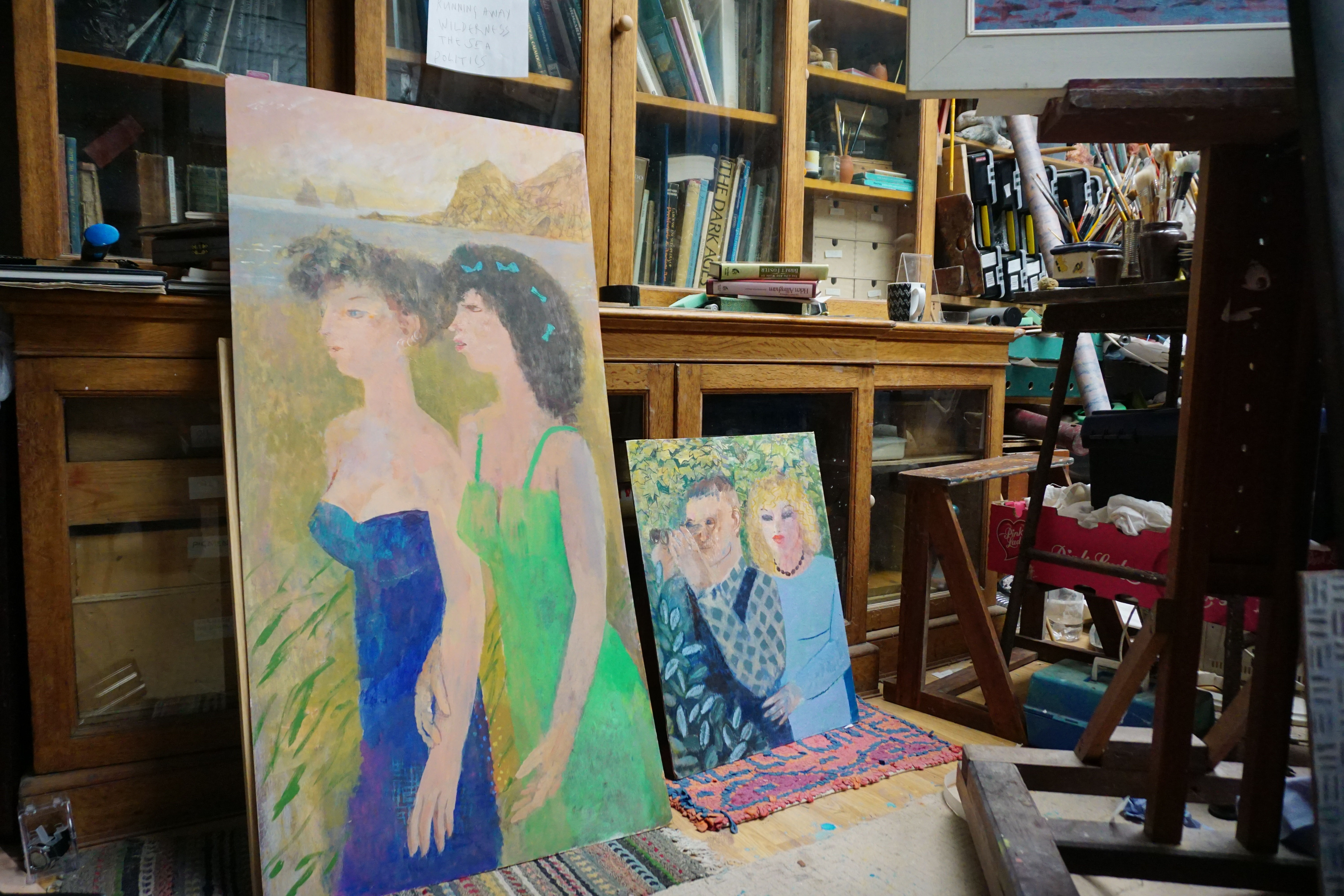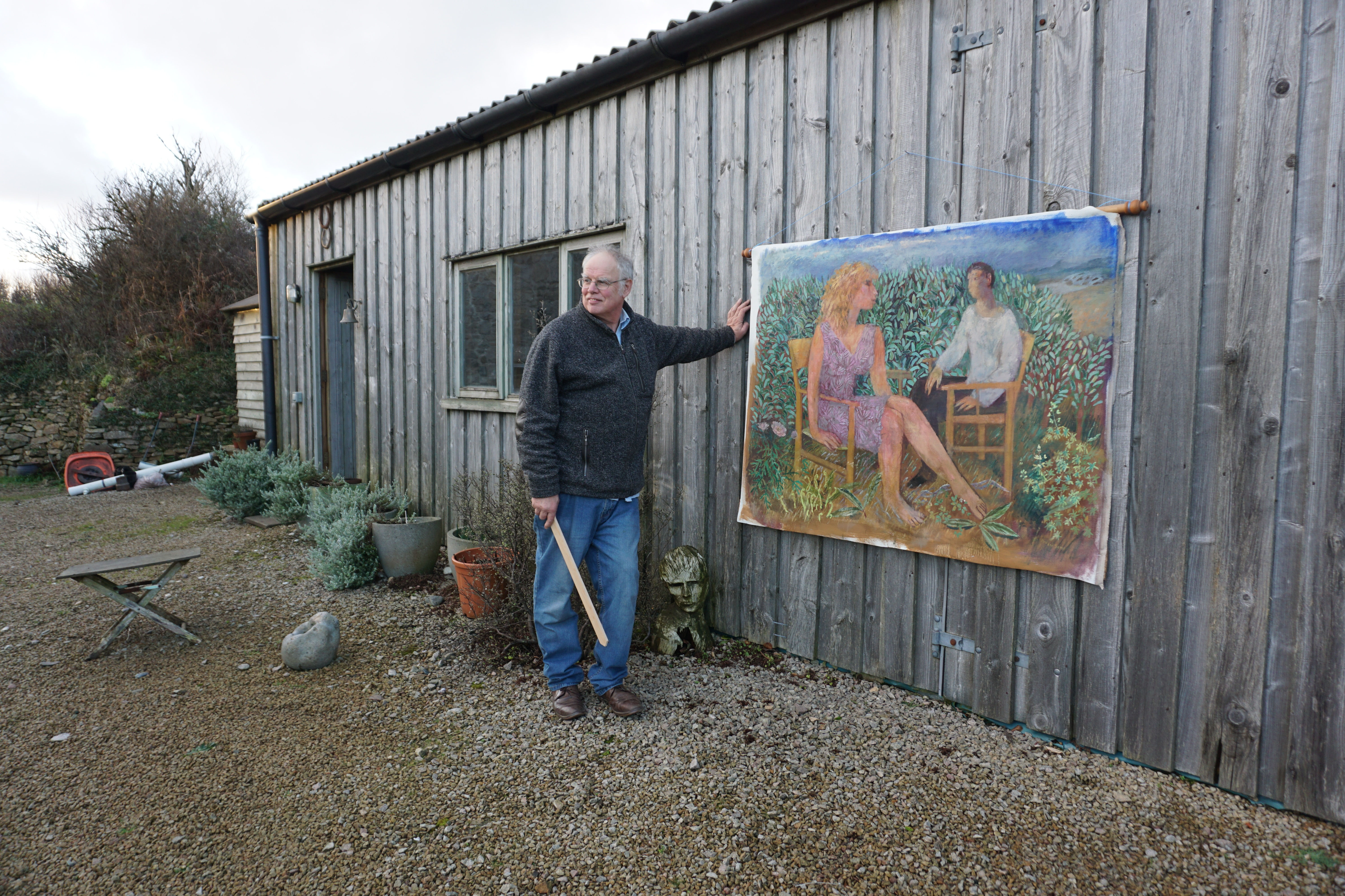 We came to live at Higher Hellangove permanently in 2009, though we had bought it some years before. The house looks out over Mounts Bay with views from Penzance and Newlyn to the Lizard. It is a spectacular view, but my studio is enclosed with curtains drawn closed and lit by rooflights, and I concentrate on internal ideas. My pictures are filled with people, but we have few passers-by on our windy hillside. The sea, which is a powerful presence here, has become more of an element in my paintings. Outside I have planted hundreds of trees and started to develop extensive gardens.