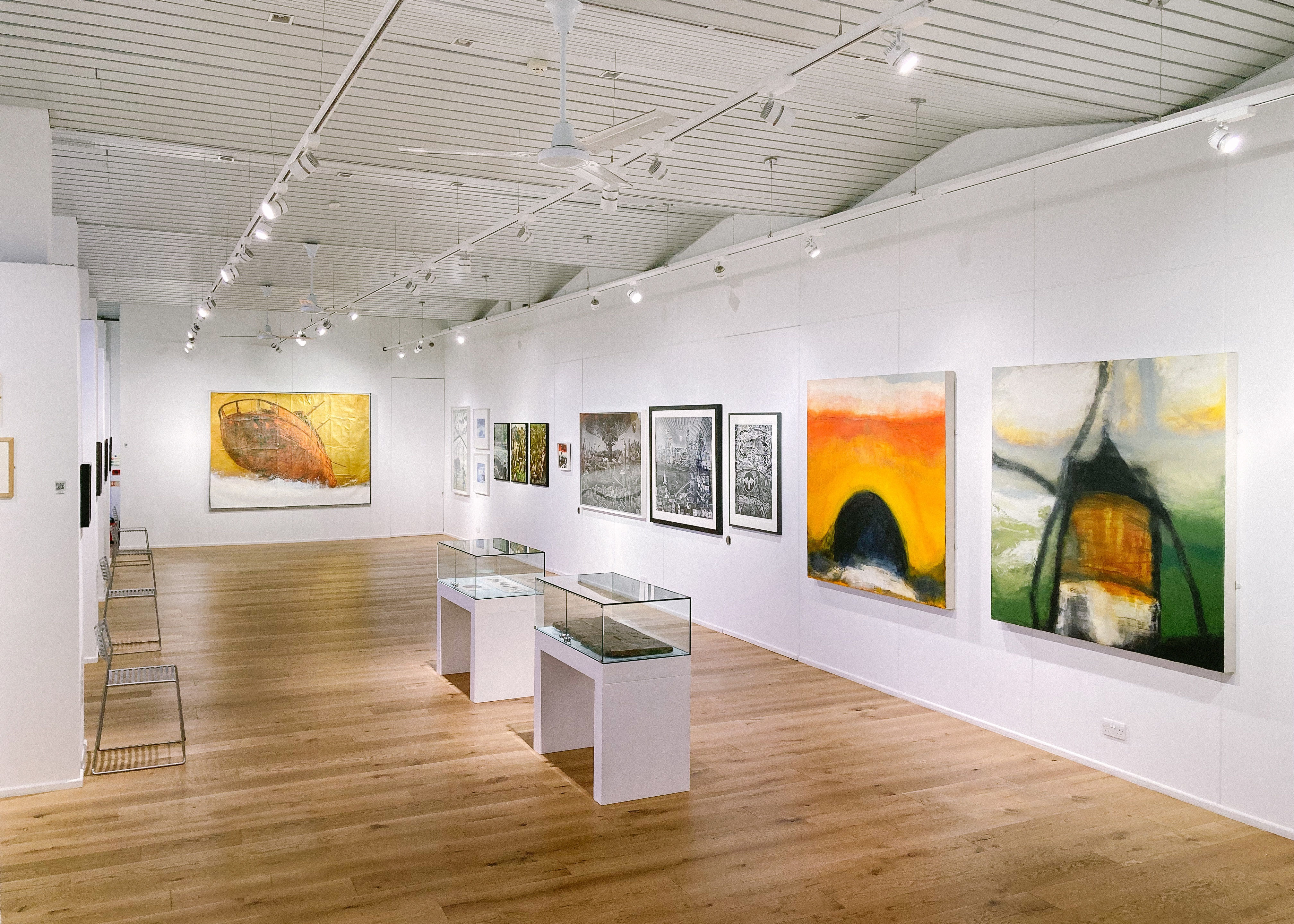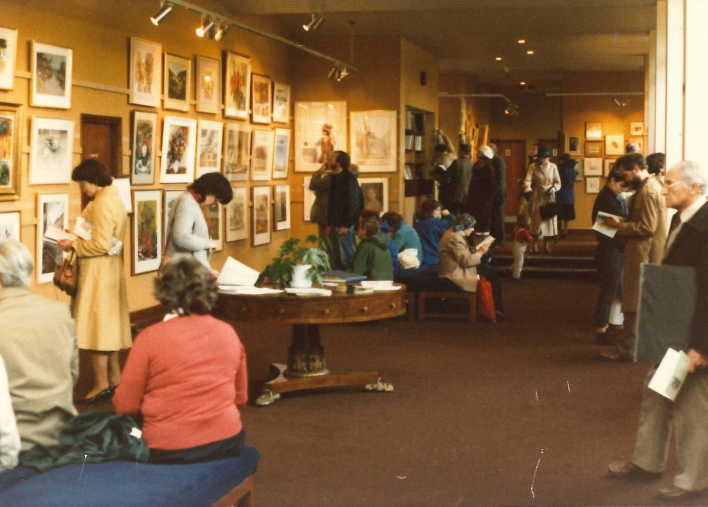 A view down the gallery from was is now the main entrance on Riverside. The round table in the centre of the room is accessioned the the Royal Watercolour Society Collection and now takes pride of place in the book shop.