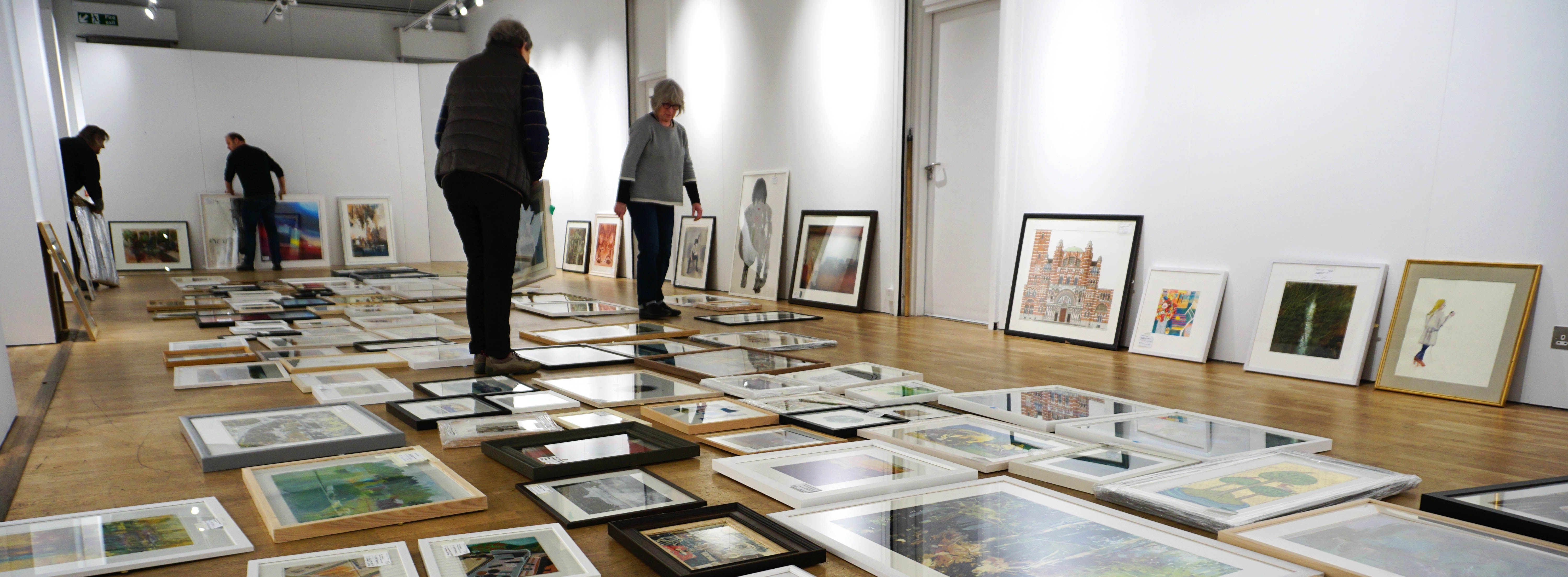 RWS hanging team laying out the Contemporary Watercolour Competition in 2018.